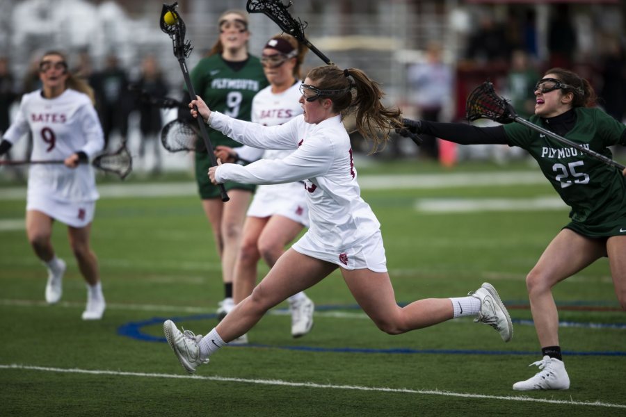 Margaret Smith ’21 of Wilton, Conn., scored the game’s first goal as No. 21 nationally ranked Bates women's lacrosse defeated Plymouth State 15-3. (Theophil Syslo/Bates College)