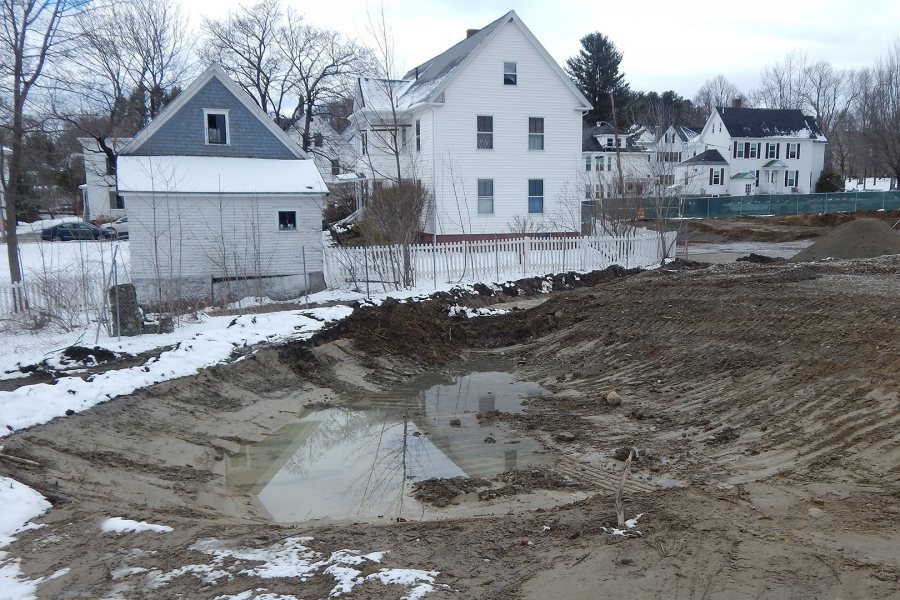 In the southeast corner, across Bardwell Street from Chu Hall, a pit has been dug that, from now until the end of time, or for at least the lifespan of the science building, will handle unwanted rainwater from the site.