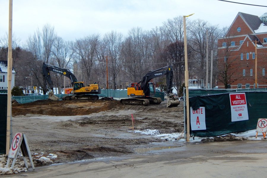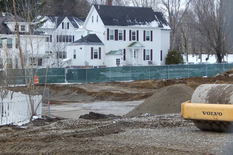 Seen over the construction fence, here’s another view of 141 Nichols St. on March 28, with Carnegie Science, Chase, and Chu halls in the background. (Doug Hubley/Bates College)