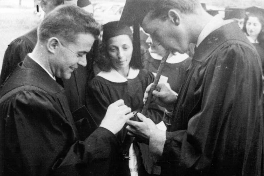 From 1968 to 1970, Bates had two Commencements each year. The first was in April for traditional four-year grads, and the second was in June or even July for graduates of the college’s new three-year option. This photo shows the April 1969 edition.