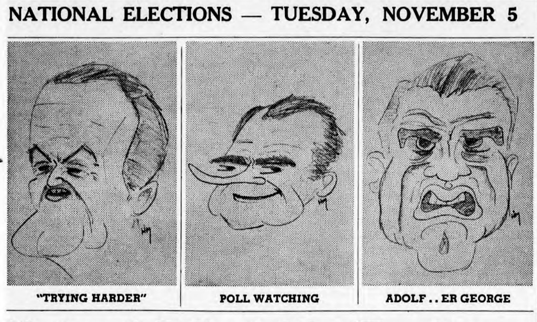 Depicting candidates Hubert Humphrey, Richard Nixon, and George Wallace, this uncredited political cartoon appeared in The Bates Student the week before the 1968 presidential election.