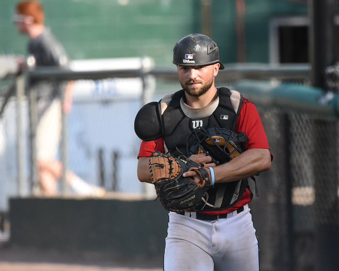 Standout Bates catcher Jack Arend ’20 dons the so-called tools of ignorance for a July 21 game vs. the Bristol Blues. (Photograph by Peggy Arend)