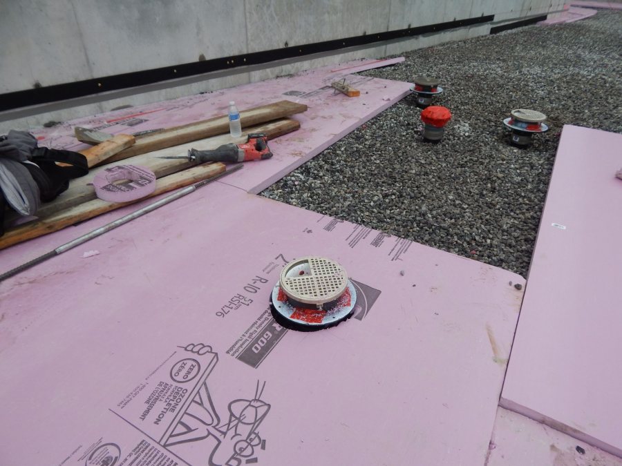 We enjoyed seeing all the colorful preparatory stuff that was laid down before the fresh concrete covered it up forever. First, a platform of compacted gravel went in to provide solid, level support. Next, over the gravel, workers layered purplish-pink foam thermal insulation panels.
