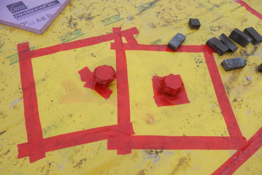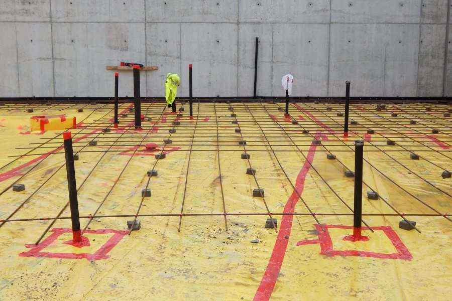 Atop the foam went a garish yellow membrane fastened together with scarlet tape, which together form a vapor-blocking system produced by Stego Industries, of California. And finally the rebar grid was installed.