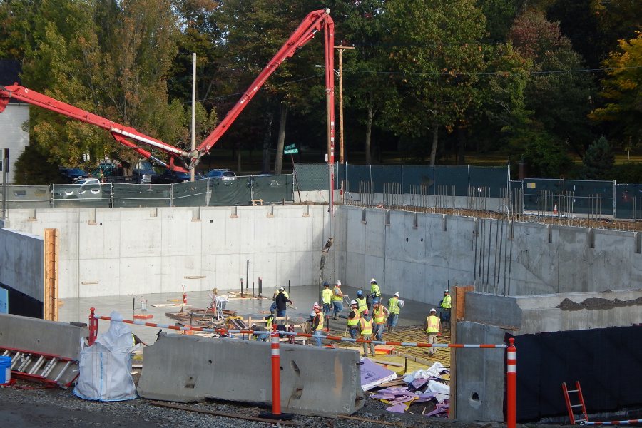 The concrete basement floor was placed in the Bonney Science Center on Oct. 3. The pumper at left is sending concrete through the boom to the furthermost corner of the basement. (Doug Hubley/Bates College)