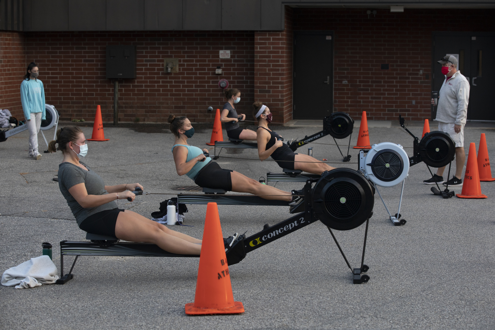 Outside Merrill Gym, head rowing coach Peter Steenstra supervises an erg workout by the varsity team. They hit the machines at 6 a.m. for an hour twice weekly.
