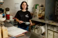 Pam and Diane share a passionate kiss on the kitchen floor. (Phyllis Graber Jensen/Bates College)