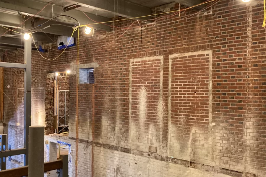 In January we’ll see the placement of floor coverings, resilient tiles and carpet tiles, on the second floor. Also on that floor, masons will repair the wall bricks where, as we explained last time, water damage affected the floor structure. Part of the floor in a new second-floor lounge has been removed for the interim (jacks and girders are holding up the remaining floor) and we like to stand by the safety rail, gaze down through the gap at Chase Hall Lounge, and think back to that three-story canyon that once was nearby.