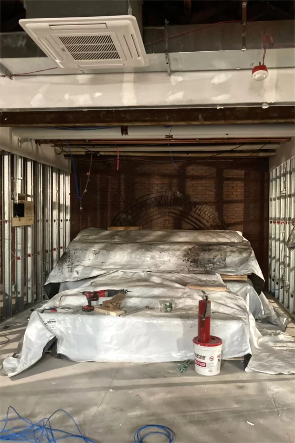 At the other end of the first floor, in Chase Hall Lounge, a new wall erected between two original brick columns separates the lounge from Purposeful Work. The replacement floor overhead that we told you about last time, necessitated by water damage to floor joists, is complete and quite beautiful.