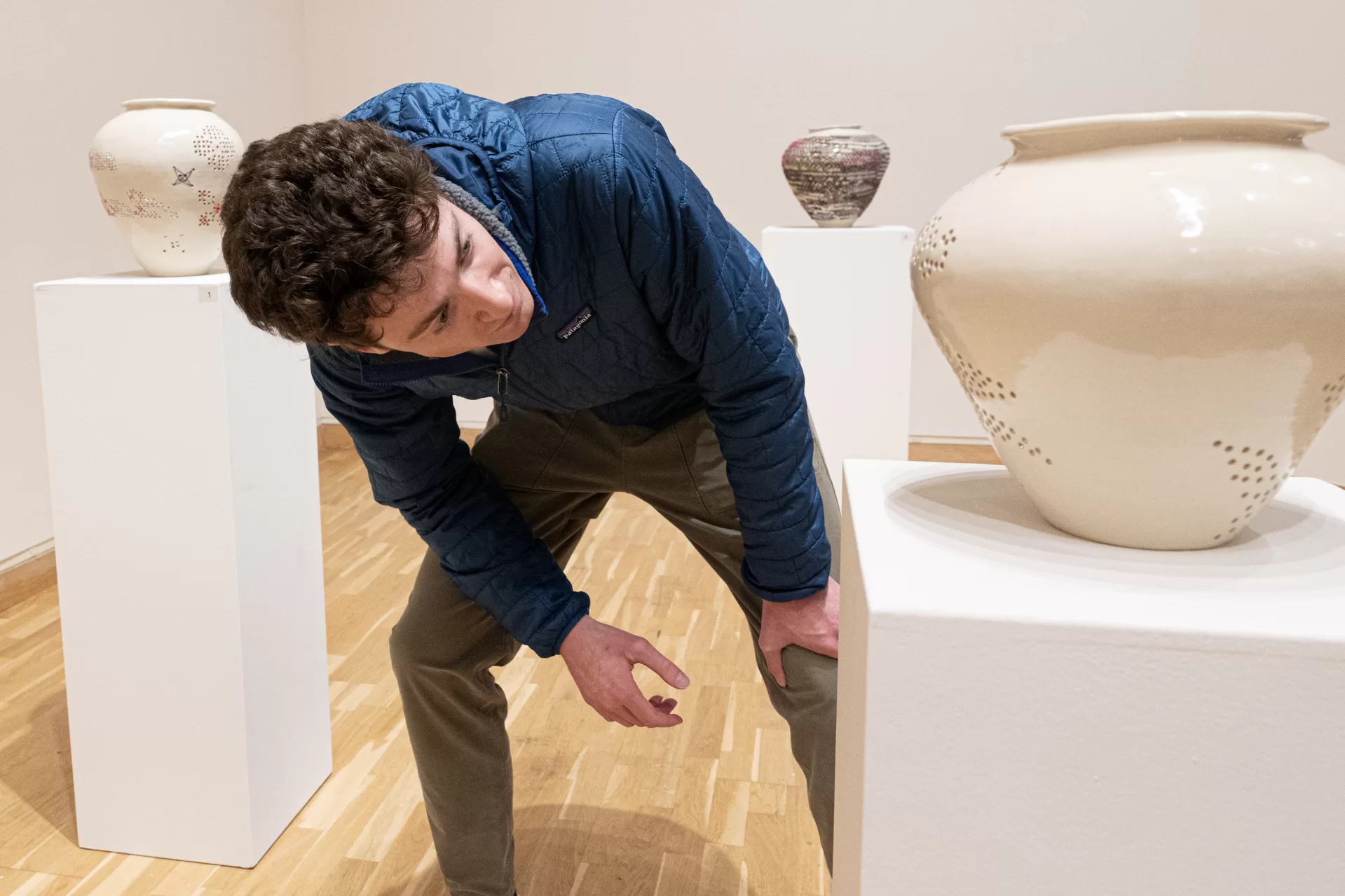 “I love these pots,” says Britton Gorfain ’25 of New York City as he takes a closer look at what his friend Alex Provasnik ’25, a studio art major from Arlington, Va., created for the 2025 Senior Thesis Exhibition, featuring the works by this year’s seven studio art majors.