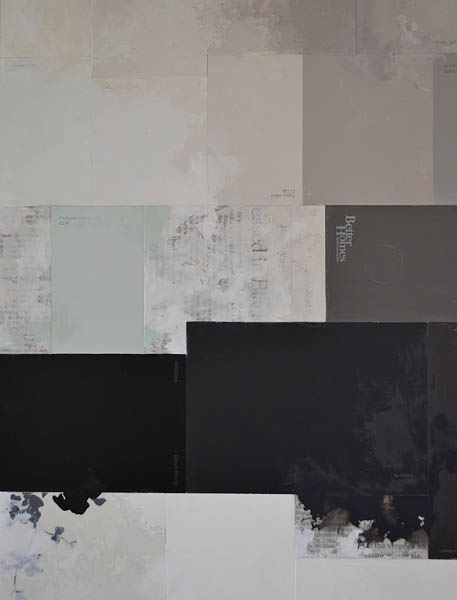She creates abstract images by layering paint chips, newspaper fragments, frosted Mylar, wallpaper and paint “until the piece feels finished.” Her work is about the relationships between words and images, and the emotions those relationships evoke among viewers.