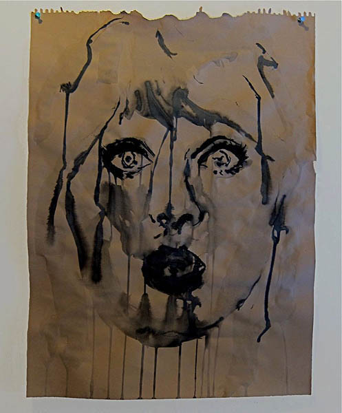 Working from photographs, she works fluidly to create portraits from “unpredictable rivulets” of ink on colored paper. Using ink, she says, enabled her “to capture the essence of an individual in broad strokes and unforeseen lines.” She adds, “I force myself to work quickly — I don’t want to fixate and I’m eager to see the final product.”