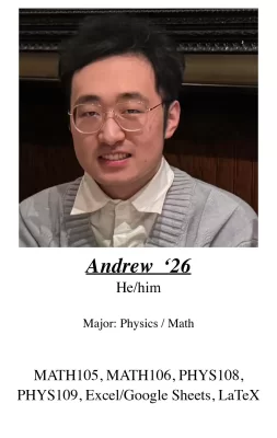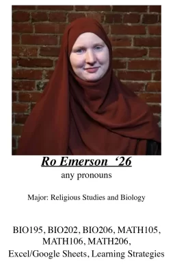 We are Bates students who connect you with the resources available to help you achieve academic success. We are Resource Representatives, Peer Tutors (both Drop-In Tutors and Course-Attached Tutors), and LAMP Fellows.